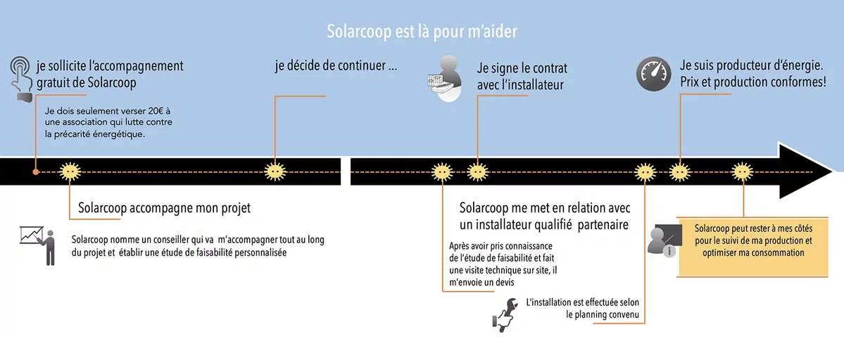 - Suivi du projet : le conseiller Solarcoop vous accompagne sur toute la vie de votre projet photovoltaïque et jusqu'à la mise en service de votre installation.